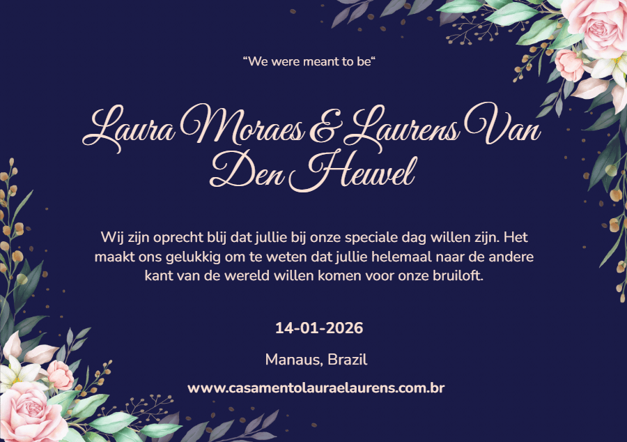 We created this website to share with you the details of our wedding planning. We are very happy and wish to see you all on our big day! Oh, and it is also important to confirm your presence. To do this, we need your help by clicking on the “RSVP” menu. Feel free to join us! We look forward to seeing you on our big day!